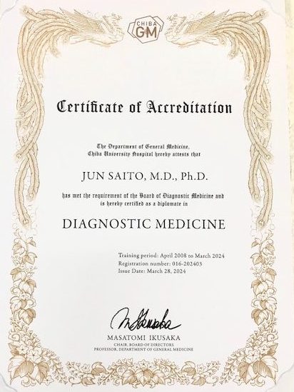 千葉大学病院 総合診療科の生坂政臣教授(現名誉教授)のお名前が入った認定証をいただきました。